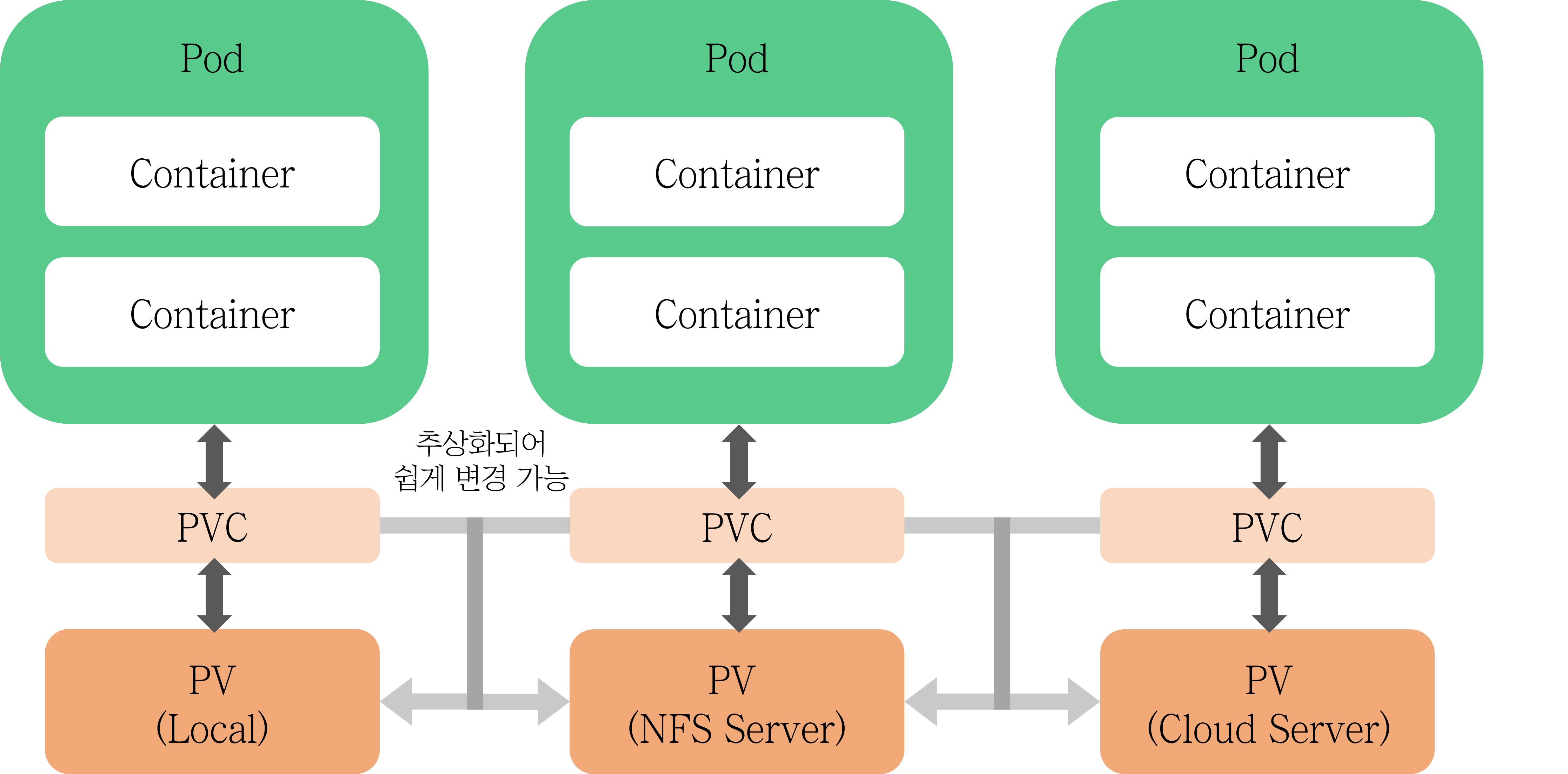 어떤 기기든지 데이터를 저장하는 역할(PV), 저장 위치를 알려주는 역할(PVC)만 하면 되도록 만들어졌다.