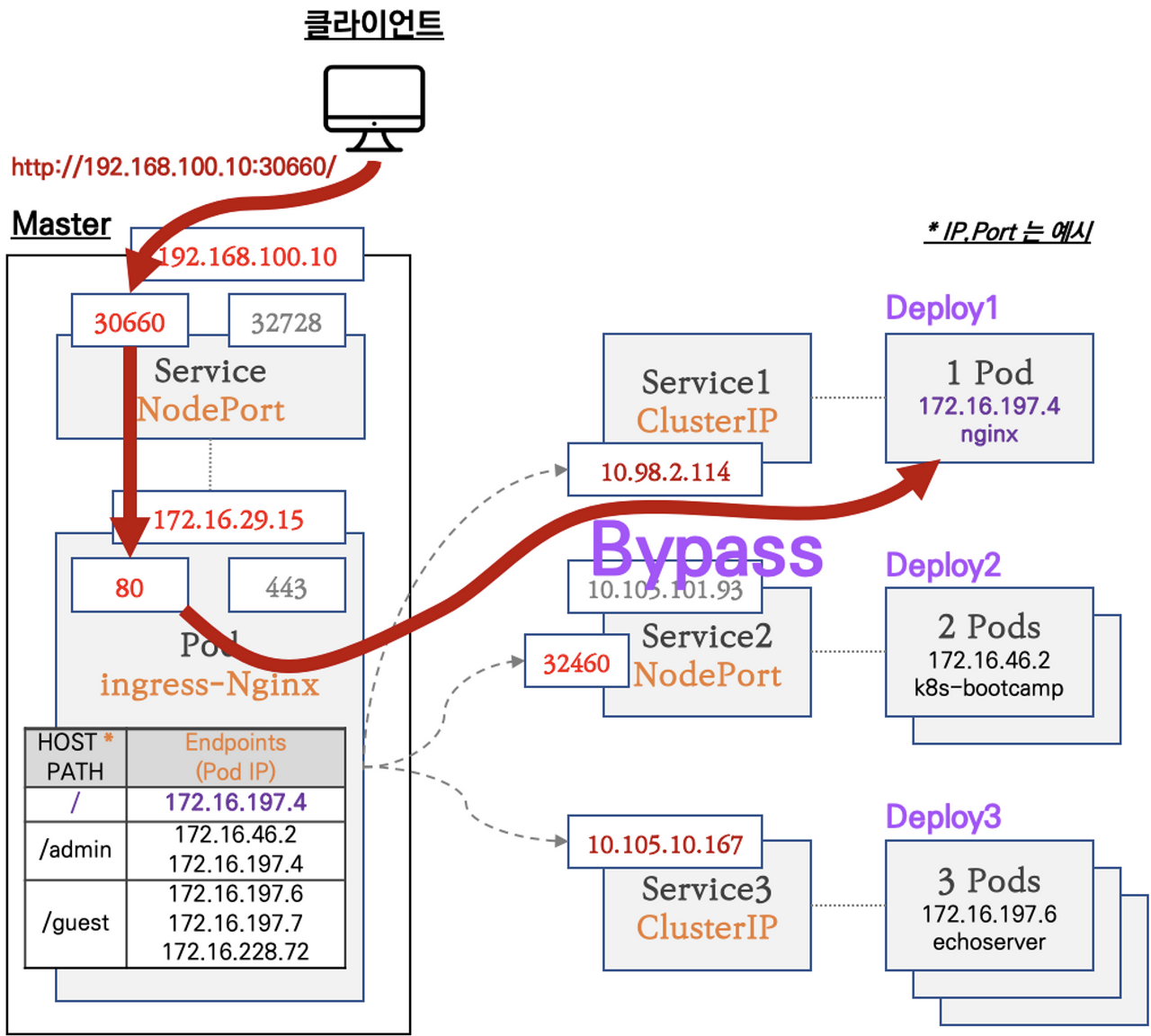 Service를 거치지 않고 IP주소만 참조해서 트래픽을 ByPass로 Pod에게 전달한다.
