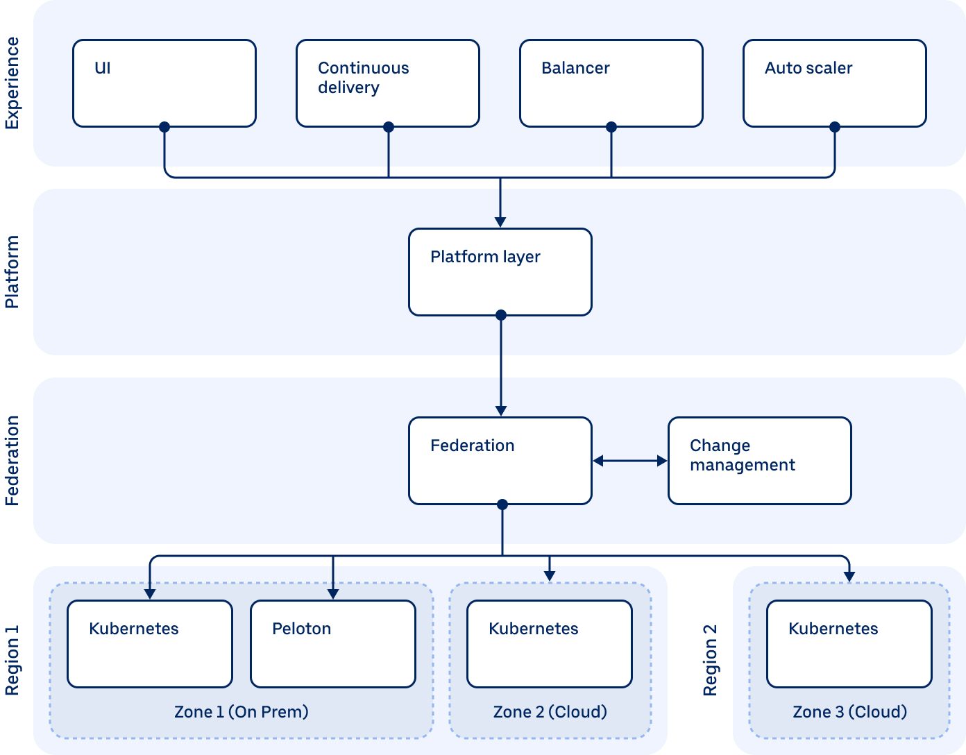 - 각 영역은 우버가 소유한 머신들의 클러스터이거나 퍼블릭 클라우드 업체의 것일수도 있지만, 특정 영역 자체는 항상 단일 업체로만 가능