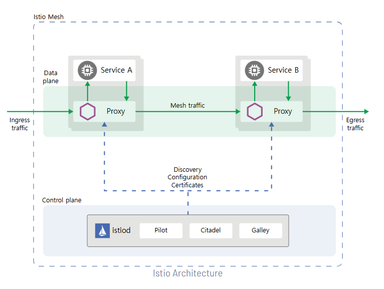 - Service Discovery 기능 제공 → Data Plane 내 Service Proxy들에게 트래픽 규칙과 구성 변경을 알려줌